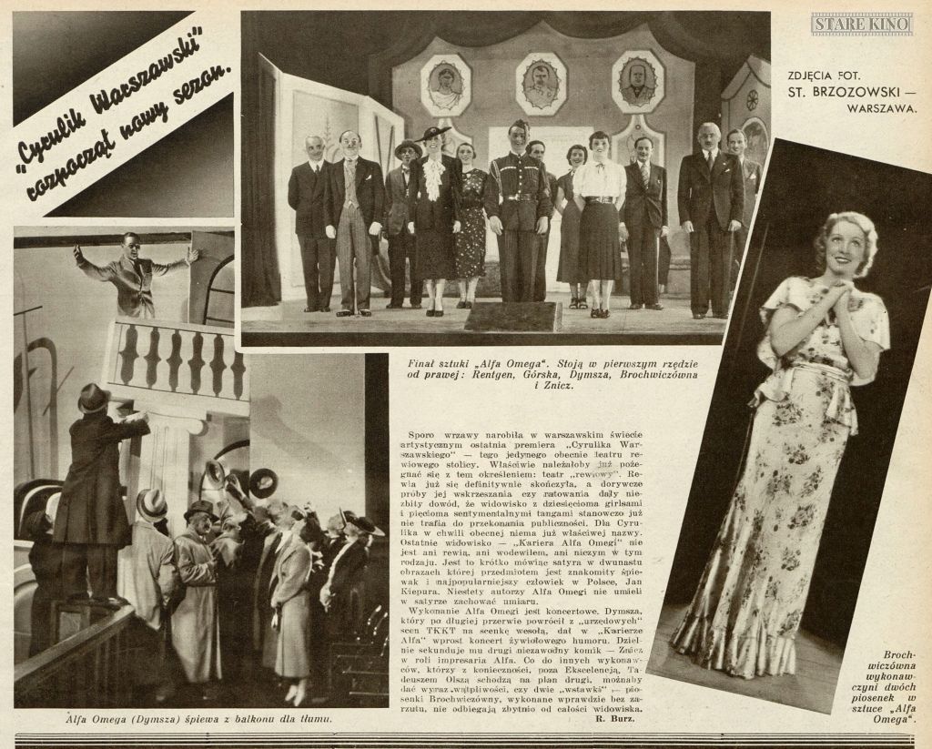 Gdyby autorowie zakończyli rzecz po prostu wysokim „C” oszałamiającej kariery śpiewaczej Jana…1, przepraszam, Alfa Omegi, opuszczalibyśmy teatr z uczuciem niezmąconej radości. Dawno, nawet w tak dowcipnym zawsze Cyruliku nie pamiętamy takiej eksplozji dowcipu i humoru. Urodzony w weselu ducha z wakacyjnego wypoczynku żart ten, lekki, nie wysilony, zaraża swoją wesołością. Biuro Państwowego Urzędu Obserwacji Lotu Ptaków – w którym odwala kawałki Alf Omega, dorabiając sobie statystowaniem w teatrzykach – jest jednym z najmilszych biur, jakie nam pokazywano w ostatnich czasach na scenie. Wysoka inspekcja spadająca znienacka na ten urząd2, zręcznie wyzyskuje humor pewnych aktualności, a kuplety odśpiewane na marginesie przez Dymszę idą po linii miłego i niebolesnego żartu. Jeszcze zabawniejszy jest drugi obraz: losy młodego Alfa na scence teatru, gdzie reżyser musi poskramiać olbrzymi głos tego chórzysty, aby nim nie pokrywał zdartego tenora, przy czym charakterystyczne jest, że nikomu nie przyjdzie na myśl, iż zamiast ten głos tłumić, lepiej byłoby go wyzyskać… Wylany z dwóch posad, wspierany przez wierną Zuzię, Alf bierze rozpaczliwy rozmach: z dostawcy papierosów Bluma stwarza sobie impresaria tłumacząc mu, że przy takim nazwisku wszystkie drzwi w Paryżu będą dla niego otwarte3. I w istocie, stosunki Bluma okazują się niezawodne, ale od innej strony: spotyka w Paryżu rodaka, który uciekł z Niemiec do Palestyny, z Palestyny do Francji, a niedługo – dodaje z rezygnacją Blum – z Francji będzie uciekał do Polski; na razie jest w Paryżu wielkim managerem teatru. Potentat ten patrzy na ewolucje Omegi z partnerką w nadwiślańskim tańcu apaszów i powiada mu: „Numer jest do chrzanu, ale pan, panie Omega, masz głos. Proponuję panu kontrakt, dam pana uczyć śpiewu, języków, a potem” itd.