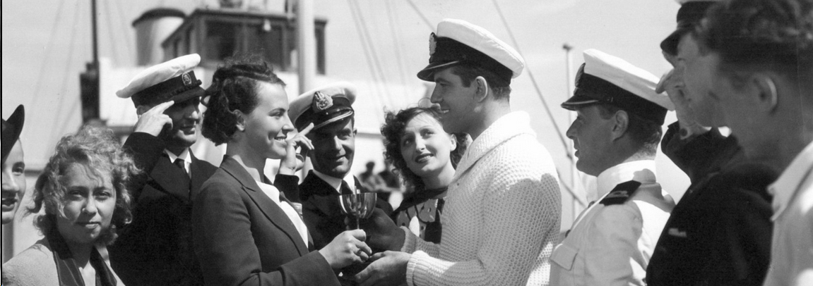 Zdjęcie wprowadzające. Fotos z filmu Rapsodia Bałtyku, w środku, pośród załogi statku, stoi Mieczysław Cybulski. Źródło: FINA / FOTOTEKA.